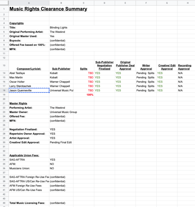 誰がどれだけのトラックを所有するかは明確ではなかったので、交渉を始めるためにまず推測する必要がありました。The Weeknd自身が作家であり、著名なヒットメーカーのMax Martinが共同作家として参加していため、これら2つの権利を同時にクリアすることにしました。これら2組の権利を合わせると、このプロセスで最大のシェアと権限が得られることが明白でした。そして関係者すべてのシェアを合わせて100%となることをベースに交渉を進めました。